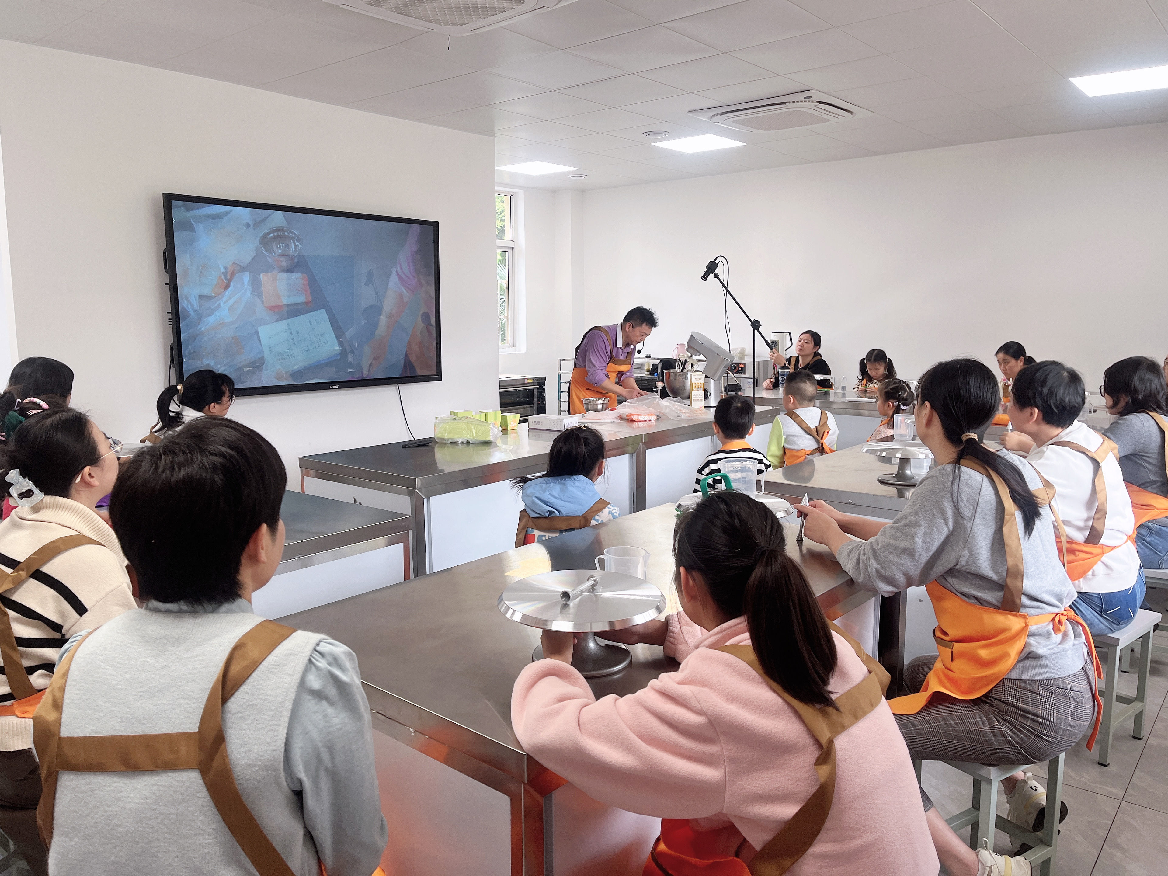 仪式结束后,烘焙教学正式开启。专业烘焙老师详细讲解了纸杯蛋糕的制作流程,从食材配比到操作步骤,从蛋黄蛋白的分离技巧到面糊搅拌的手法要领,再到烤箱温度与时间的精准把控,每一个环节都耐心讲解、细致演示。老师还现场示范了奶油打发的关键技巧,确保每组家庭都能掌握制作精髓。