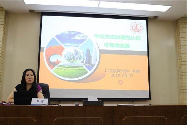 上午聆听了由北京教育学院校长培训学院李雯副院长所做的《学校改进的理性认识与有效实践》的专题讲座。此讲座先由互动栏目开始,让与会的校长们先从微信公众号上提交自己所在学校最需改进的三个问题以及推进改进的三个最有力的因素切入,然后李院长一一剖析和深刻点评。在此基础上李院长从学校改进的起点、终点、生长点、支撑点四个方面娓娓而叙学校改进的理性认识与有效实践,李院长的报告时达三个半小时,博识而又十分的接地气,赢得了全体学员的深深敬服。报告中有许多精辟而又新颖的观点不断闪现:把难题清清楚楚的写出来,便已经解决了问题的一半;名校长既是做出来的,也是写出来的;好的理论是聪明人用心实践出来的;相同的往往是规律,各自的往往是特色;校长转身,学校才能转型等等。同时她列举了许多鲜活而又富有热气的案例对学员们予以指点,印象最深的是她列举的北京实验二小课堂举手提问的事例,北京实验二小的课堂举手里藏有大学问——正常举手代表我想回答问题,举起手后用一小指头勾动代表我还有问题没弄明白请老师听我说,举起手后四指头不停的招是告诉老师这节课老师您还没有找我回答问题呢。