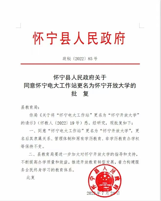 2022年7月,经怀宁县人民政府批准,怀宁县电大工作站更名为怀宁开放大学。怀宁开放大学由怀宁县人民政府举办、怀宁县教育局主管,是一所服务全民终身学习的新型高等学校,运用现代信息技术面向全县开展学历教育、继续教育、老年教育、社区教育和各类教育服务。怀宁开放大学在国家开放大学和安徽开放大学的指导管理下,统一招生录取、统一学籍管理、统一专业课程、统一教材、统一教学、统一考试、统一毕业颁证。