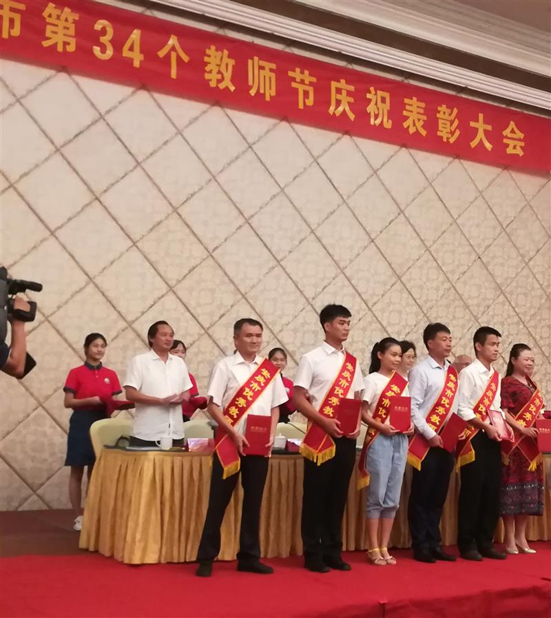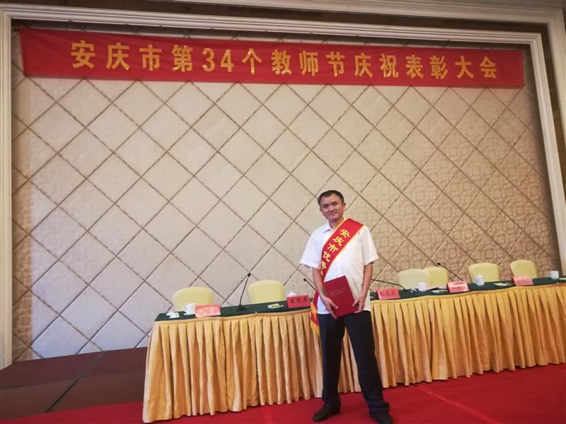 9月7日下午,在全市第34个教师节庆祝表彰大会上,华体网页版页面登录汪贵生老师荣获2018年“安庆市优秀教师”荣誉称号并作为优秀教师代表上台领奖;殷勇老师荣获2018年“安庆市优秀班主任”荣誉称号。