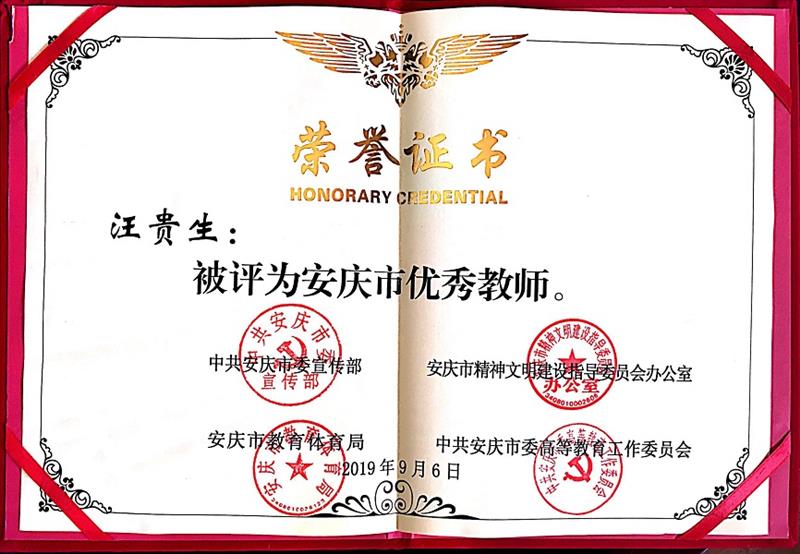 华体网页版页面登录汪贵生老师荣获2019年度“安庆市优秀教师”称号