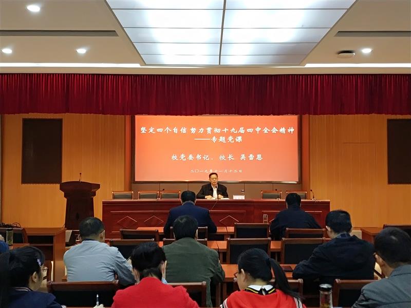 为深入学习贯彻十九届四中全会精神,扎实开展“不忘初心、牢记使命”主题教育, 11月12日下午,华体网页版页面登录在C栋205会议室开展专题党课活动。党课主题为“坚定四个自信  努力贯彻十九届四中全会精神”,由校党委书记、校长吴雪恩授课。校党委委员、副校长周光纯,校党委委员、副校长王佩捷与全体党员、中层以上干部一起聆听了党课。