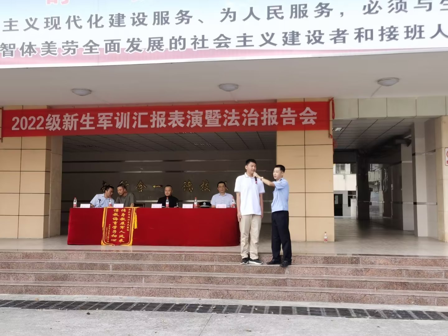 最后,校党委委员、副校长王付清同志向人武部赠送了“言传身教展军人风姿,谆谆教诲育学子初心”的锦旗,向军训中辛勤付出的各位教官和工作人员表示感谢。并希望参训新生牢固树立“祖国安危、人人有责”的爱国主义思想,注重学习、努力拼搏,为将来建设祖国保卫国家奠定坚实基础。要深刻认识到身体健康和意志坚定的重要性,多参加体育锻炼,努力做一名意志坚定的学生。要把军训期间严于律己、团结互助的优良作风带到今后学习生活中去,牢记自己立志成才、立德成人的理想抱负,张开双臂迎接充满挑战的明天。