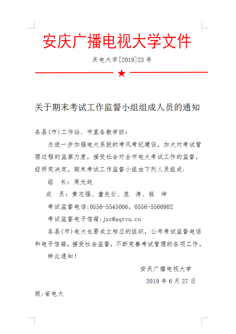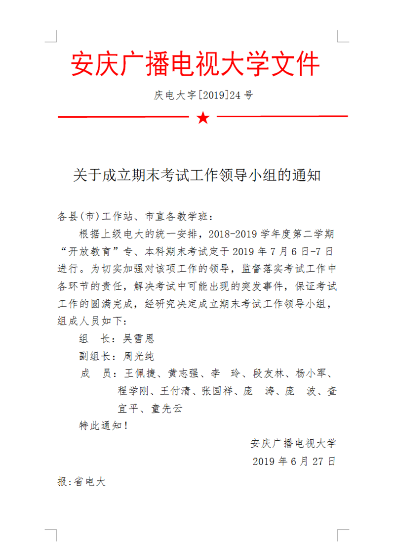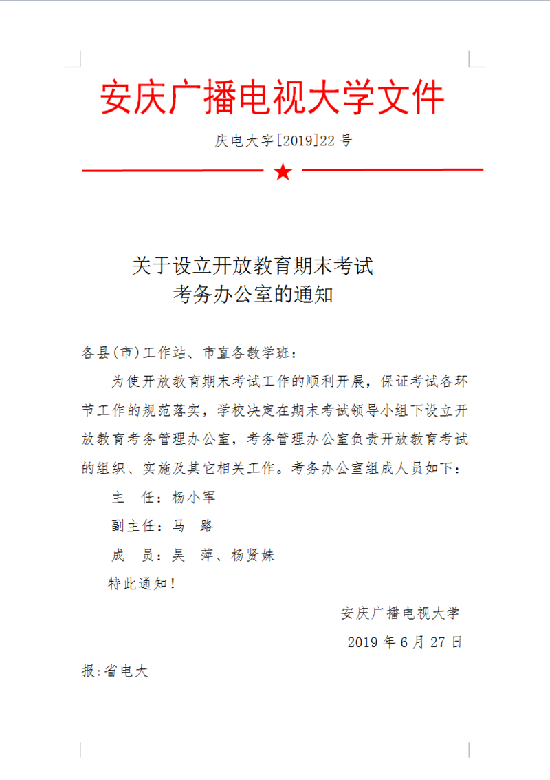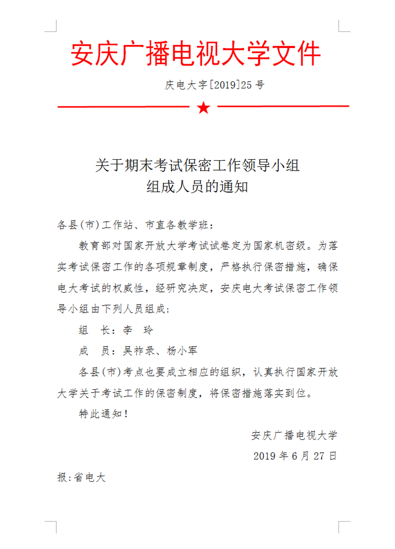 关于设立开放教育期末考试工作领导小组、考务办公室、工作监督小组组成人员及保密工作领导小组组成人员的通知