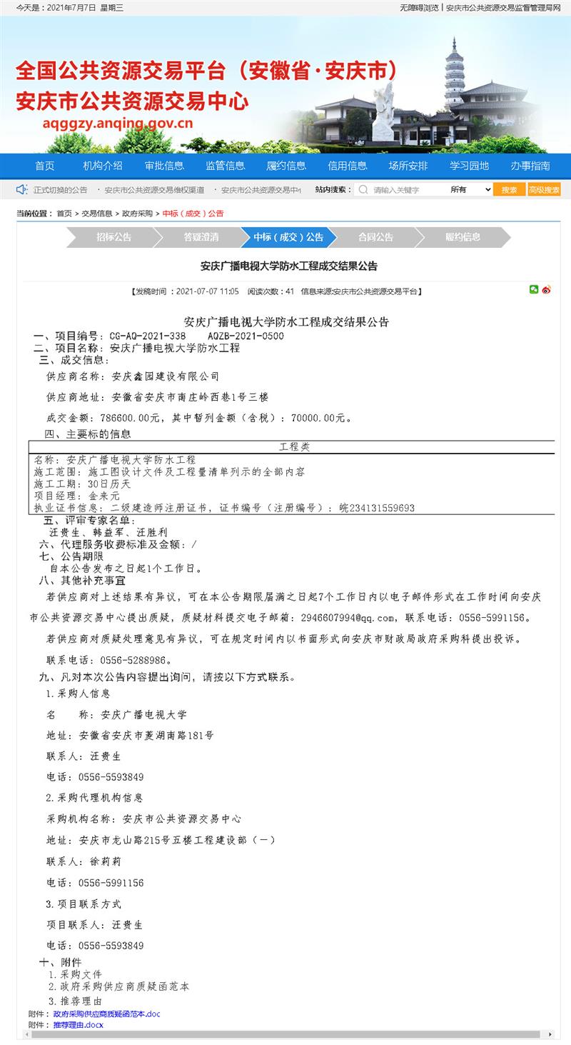安庆广播电视大学防水工程成交结果公告