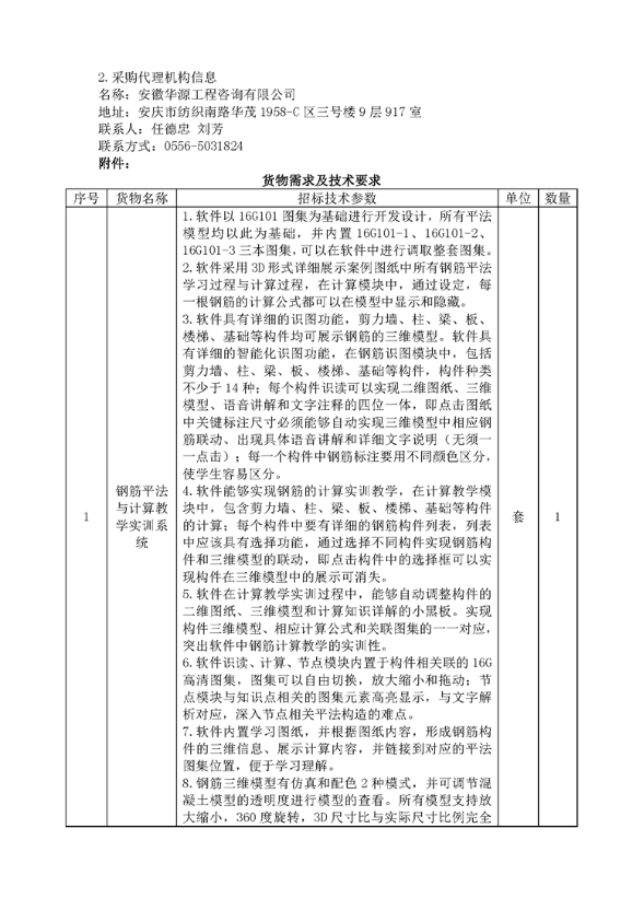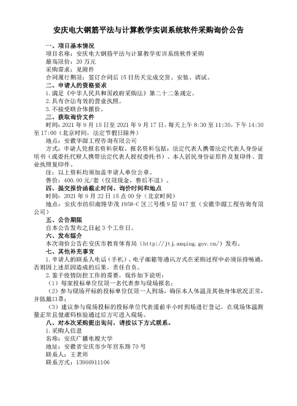安庆电大钢筋平法与计算教学实训系统软件采购询价公告