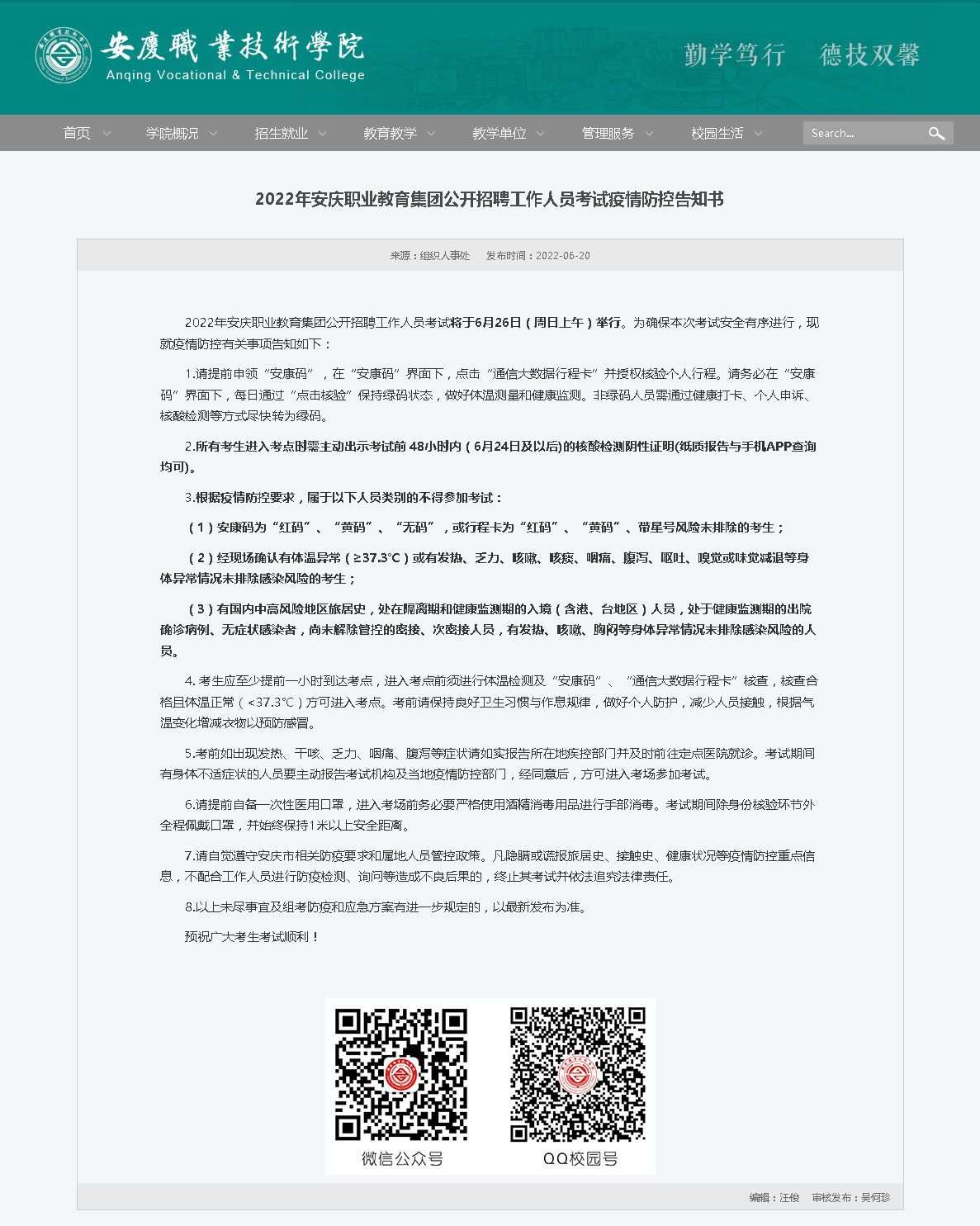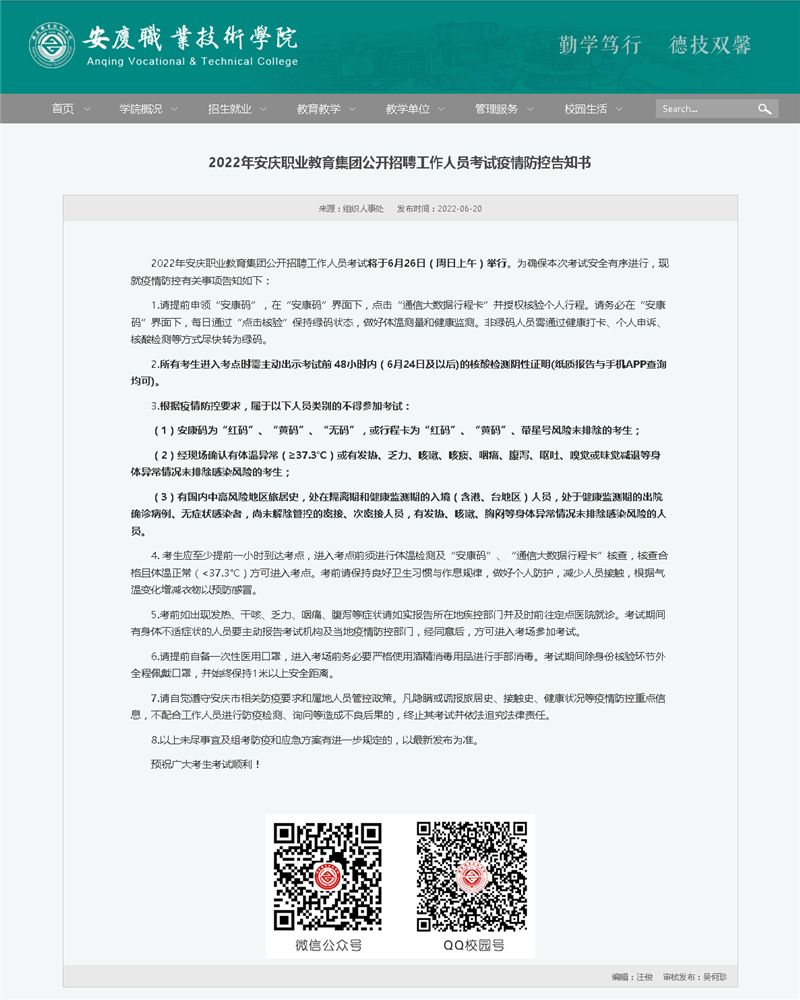 2022年安庆职业教育集团公开招聘工作人员考试疫情防控告知书