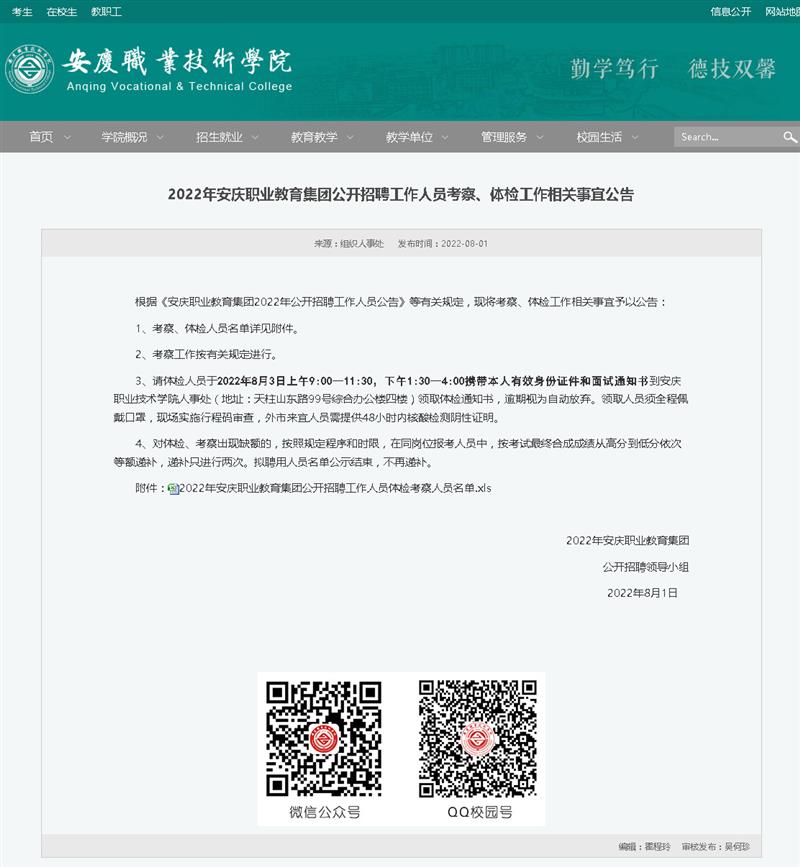 2022年安庆职业教育集团公开招聘工作人员考察、体检工作相关事宜公告