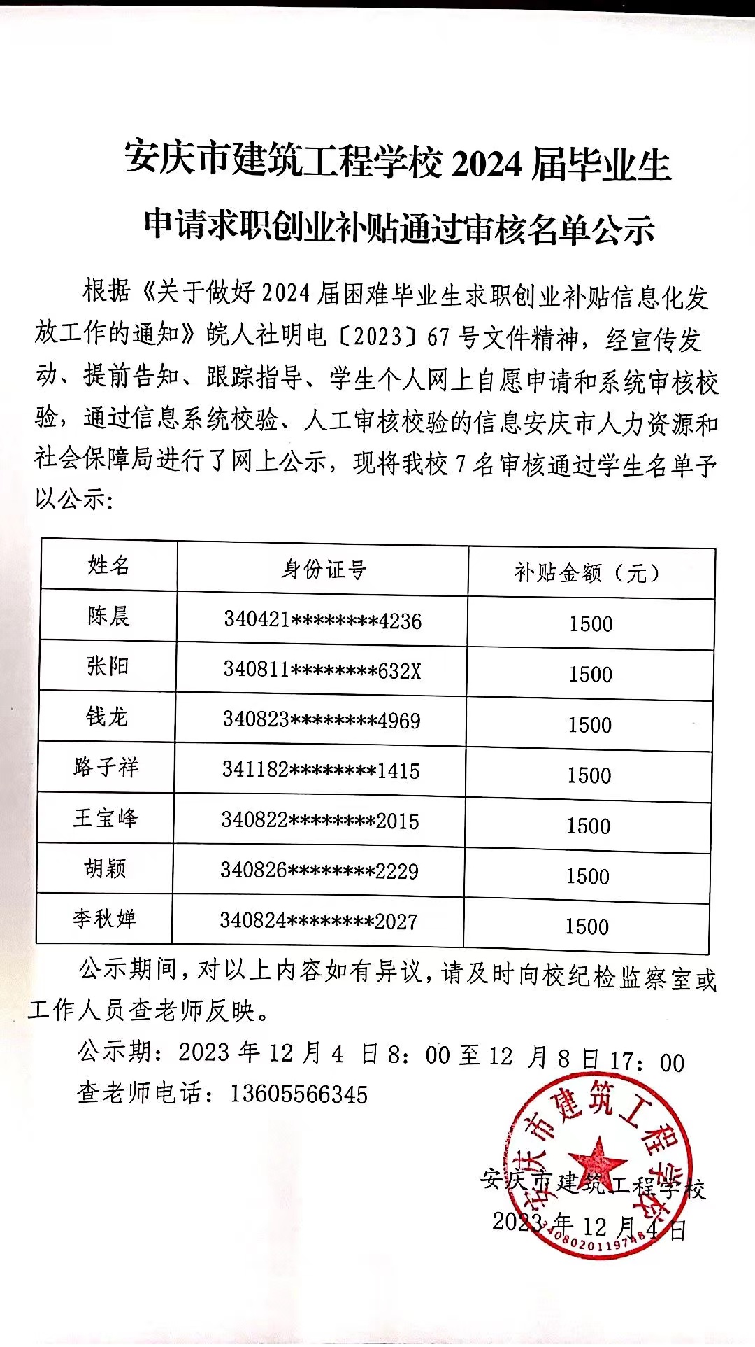 安庆市建筑工程学校2024届毕业生申请求职创业补贴通过审核名单公示