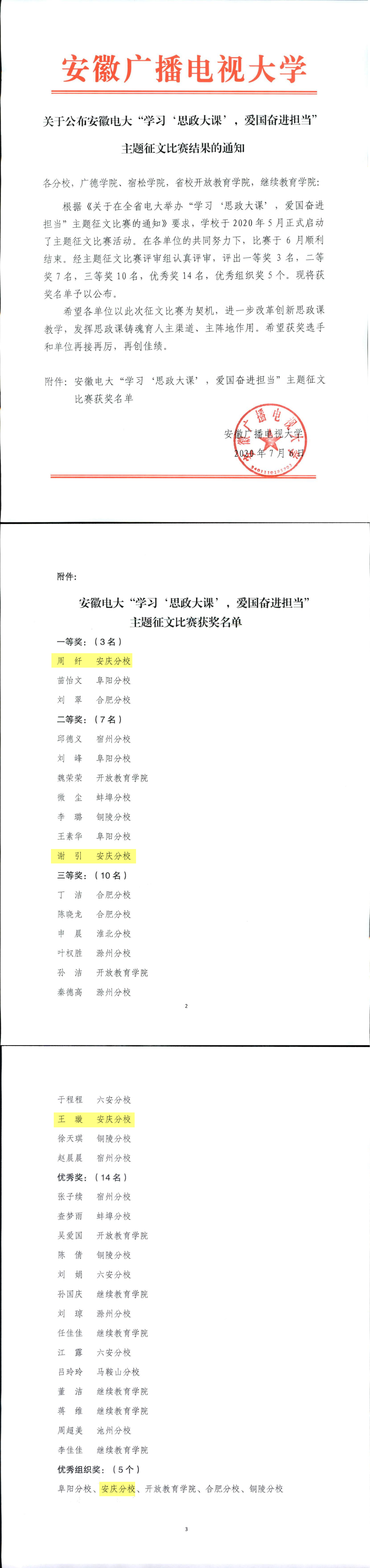 在刚刚结束的安徽电大“学习'思政大课',爱国奋进担当”主题征文比赛中,华体网页版页面登录周纤同学荣获一等奖,谢引同学获二等奖,王璇同学获三等奖。学校获优秀组织奖。