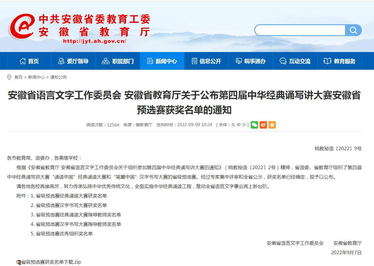 华体网页版页面登录学员在第四届中华经典诵写讲大赛安徽省预选赛中喜获二等奖