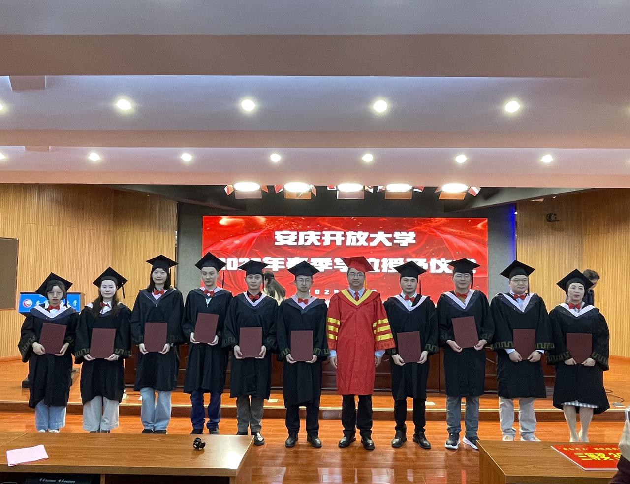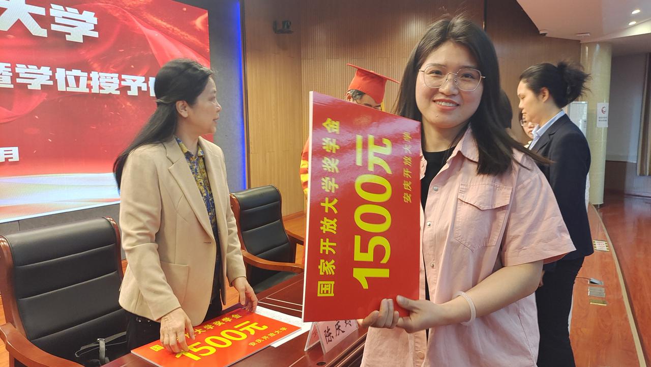 仪式中,校领导为获得国家开放大学、安徽开放大学奖学金及华体网页版页面登录第二届短视频大赛优胜奖的学生颁奖,王佩捷为2024年秋季学期获得国家开放大学学士学位的学生代表授予学位并合影留念。