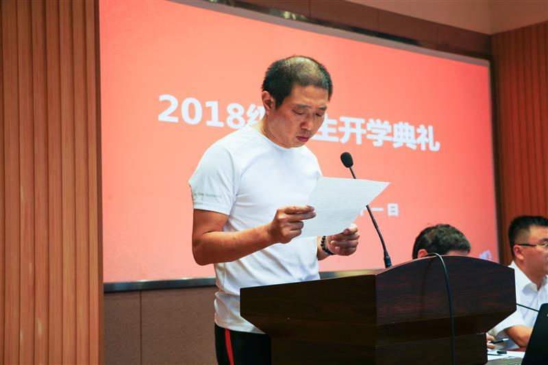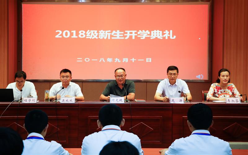 开学典礼在雄壮的国歌声中拉开序幕。首先,周校长代表学校对新同学表示热烈的欢迎。他对2018级全体新生提出四条红线不能逾越;四条规定要遵守;九点要求要做到。最后周校长三点希望,希望新生们可以调整心态,积极主动的适应学校的学习和生活环境,寄语同学们把握机遇、奋发有为,脚踏实地、学有所成。