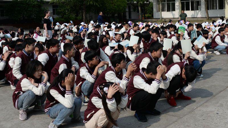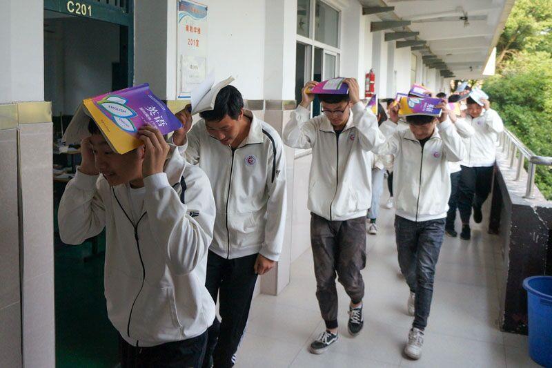 5月10日下午15:50演练开始,地震警报响起,各班学生迅速采取避震措施,抱头、就近蹲到课桌旁、墙壁边以保护自己。30秒后,信号员发出“紧急疏散”信号,同学们有序撤离教室,按预定的疏散通道和线路快速、有序、安全地疏散到操场上的安全区域。各楼道楼层疏散护导人员与班主任协同配合,共同做好了学生疏散撤离的安全引导和巡护。撤离过程中,师生反应敏捷,行动迅速,撤离井然有序。班主任及时清点班级安全疏散撤离人数等情况,并将具体情况报给现场指挥。