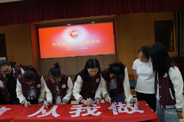 最后,老师和同学们在“践行诚信从我做起”的条幅上郑重签上自己名字,现场气氛热烈,秩序井然。