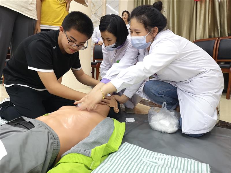 随后,全体学生在医务人员的指导下,根据培训中讲授的理论知识,分组分批次利用急救模拟人开展心脏按压、清除异物、开放气道、人工呼吸等心肺复苏模拟救护。判断是否丧失意识、有无自主呼吸、有无脉搏……医务人员边演示边讲解急救步骤、手法要点等规范要求。学生们听得认真,看得仔细,将心肺复苏操作要领熟记于心,积极参与互动,活动现场气氛热烈。