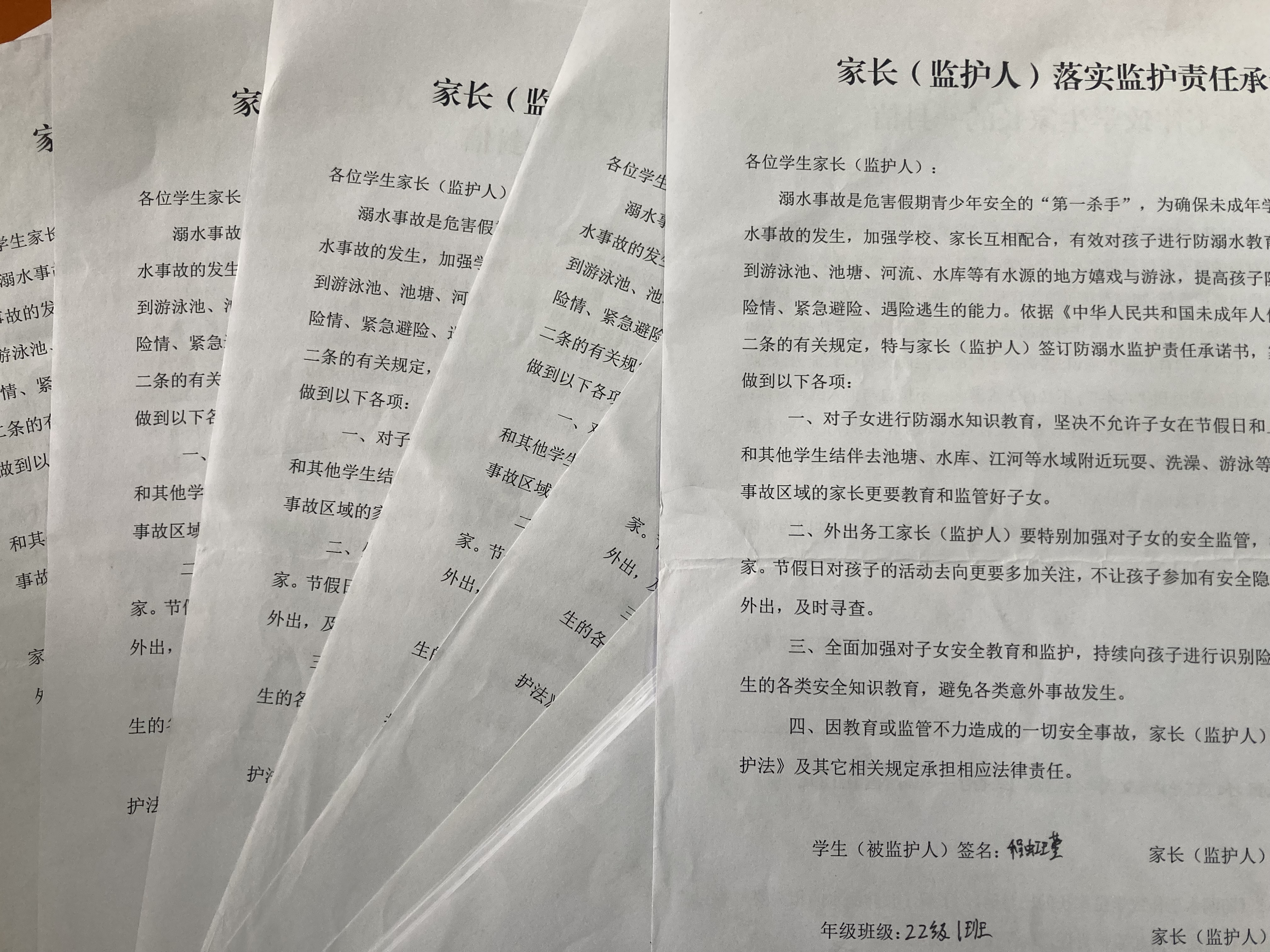 学校及时发放《家长(监护人)落实监护责任承诺书》《防溺水工作致学生家长的一封信》至家长和学生手中,把预防溺水的知识宣传到每个学生家庭,并请家长共同做好学生离校期间的安全监管,督促家长认真履行监护责任,特别是节假日、暑假等的安全监管,切实保障学生的生命安全。