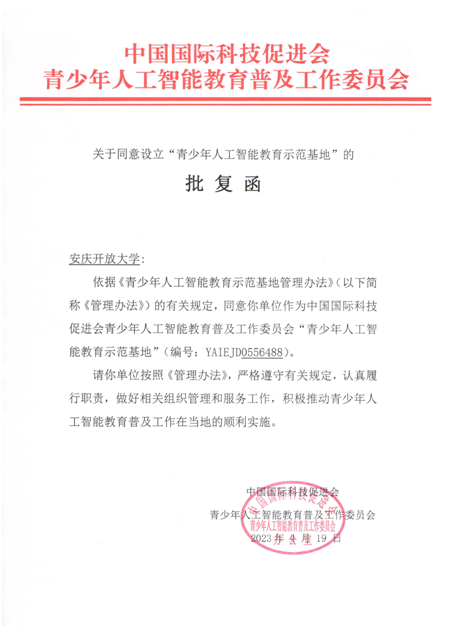 近期,华体网页版页面登录被中国国际科技促进会授予“青少年人工智能教育示范基地”称号,是安庆市唯一一家获此殊荣的单位。