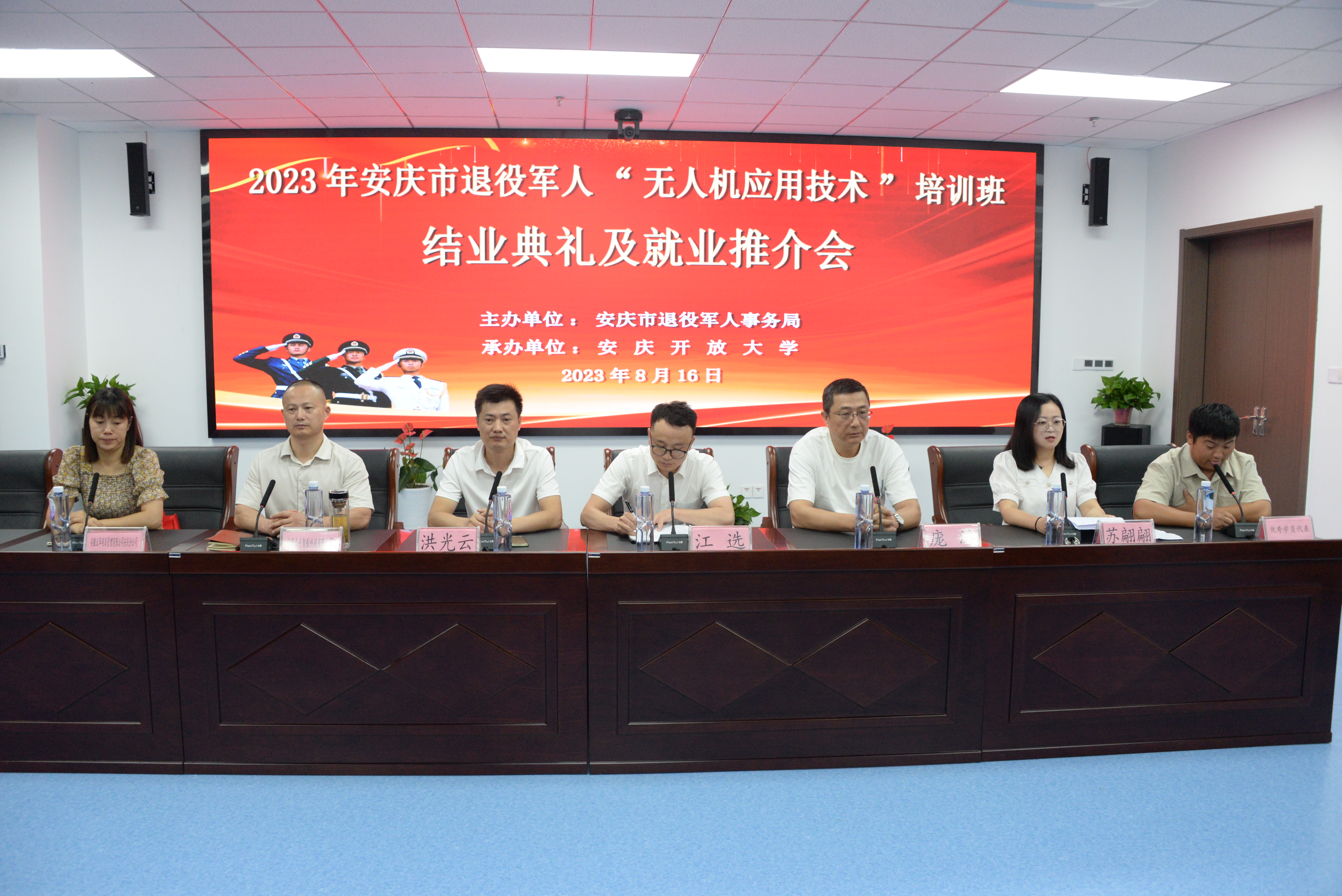 8月16日上午,华体网页版页面登录举办的2023年安庆市退役军人“无人机应用技术”培训班举行了结业典礼及就业推介会。安庆市退役军人事务局就业创业科江选、安庆市开放大学终身教育学院洪光云、苏翩翩、班主任庞涛、相关企业代表及参训学员参加典礼,典礼由苏翩翩主持。