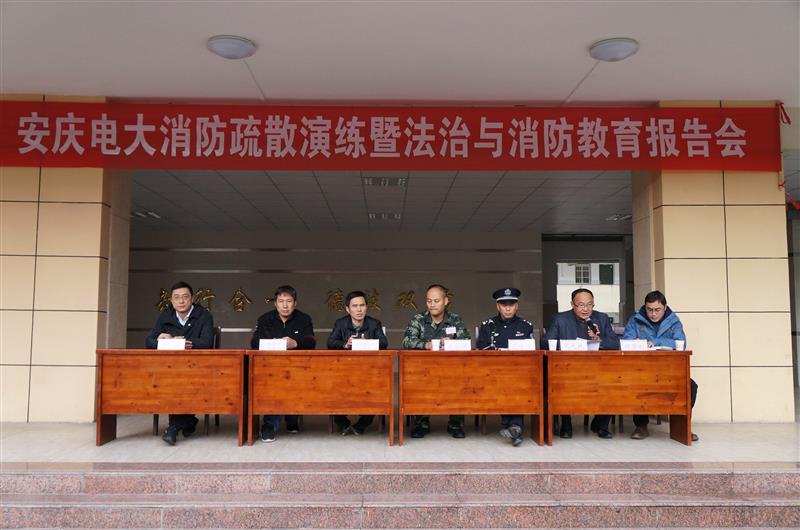 为进一步增强全体师生的法治意识和消防安全意识,切实提高同学们的自我保护意识和安全自救能力,11月8日下午,在 “119全国消防安全宣传日”来临之际,华体网页版页面登录举办“消防疏散演练暨法治与消防教育报告会”。安庆消防特勤中队中队长连小国,华中路街道办处主持行政工作的副书记檀四明,华中路派出警长沈方俊,程墩路居委会书记张宏军,职成处主要负责人程学刚,保卫处主任庞涛出席,全体全日制师生参加了会议,报告会由副校长周光纯主持。
