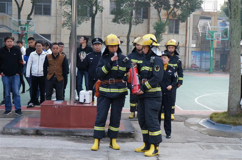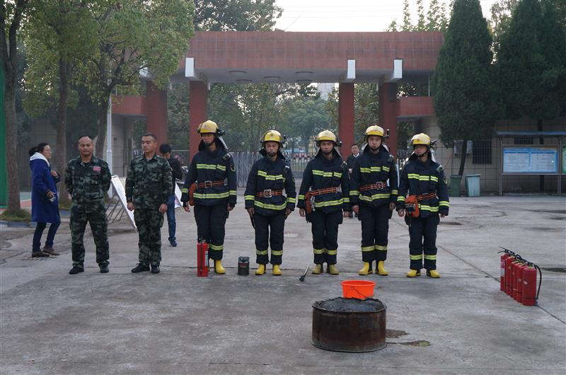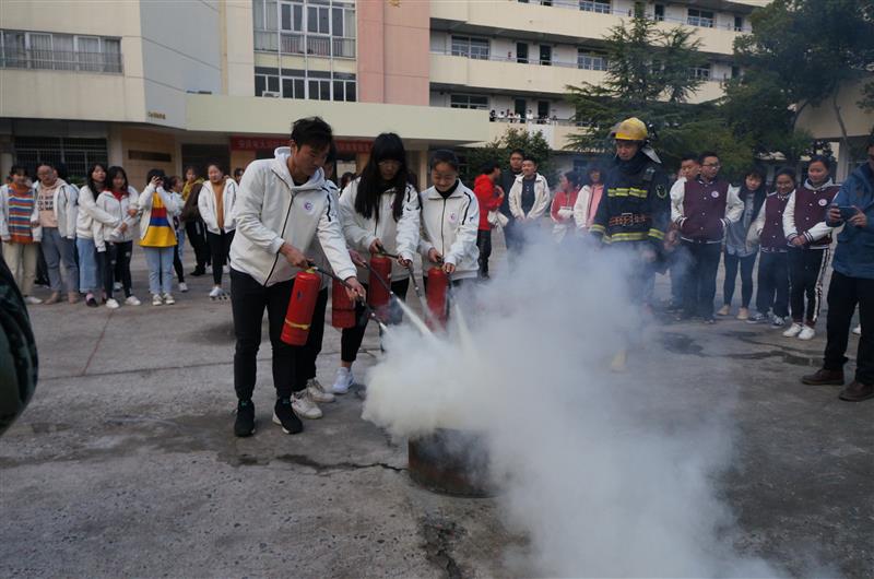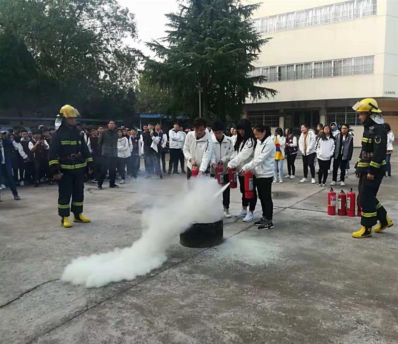 疏散活动结束后,进行火盆干粉灭火演练。演练中,消防官兵向全校师生示范并讲解了如何正确使用灭火器及使用要领,各年级学生代表参加了灭火实战演练。