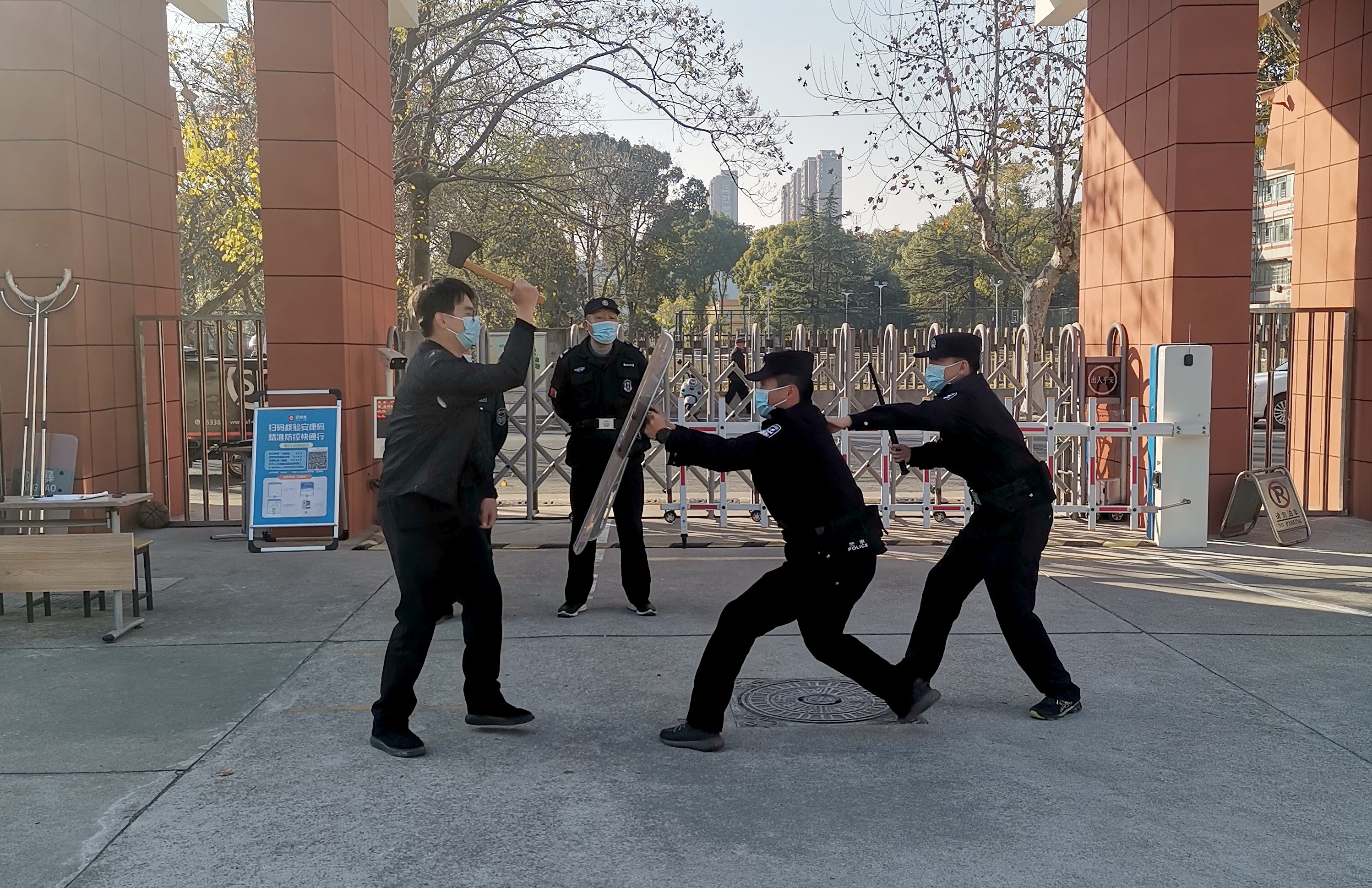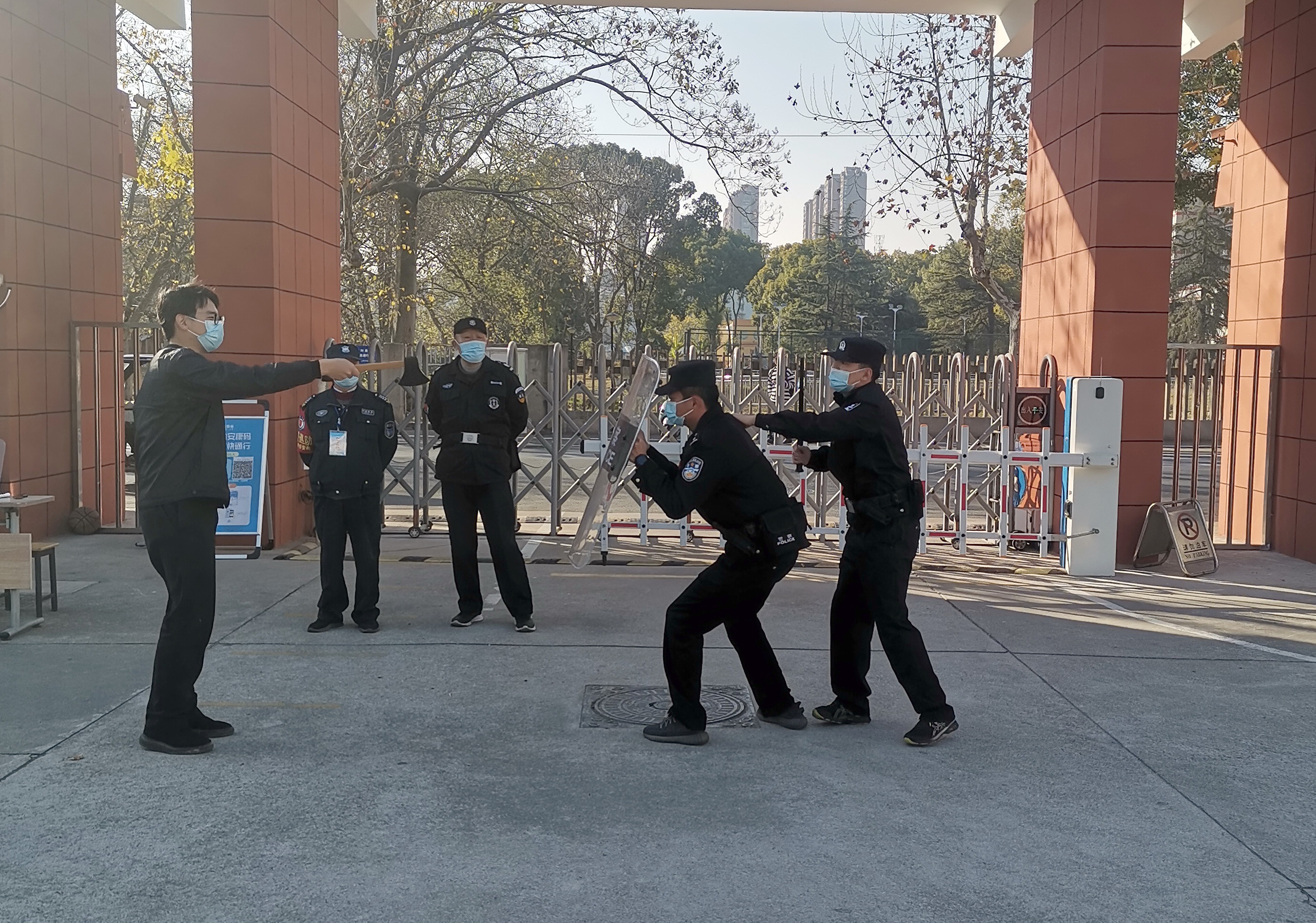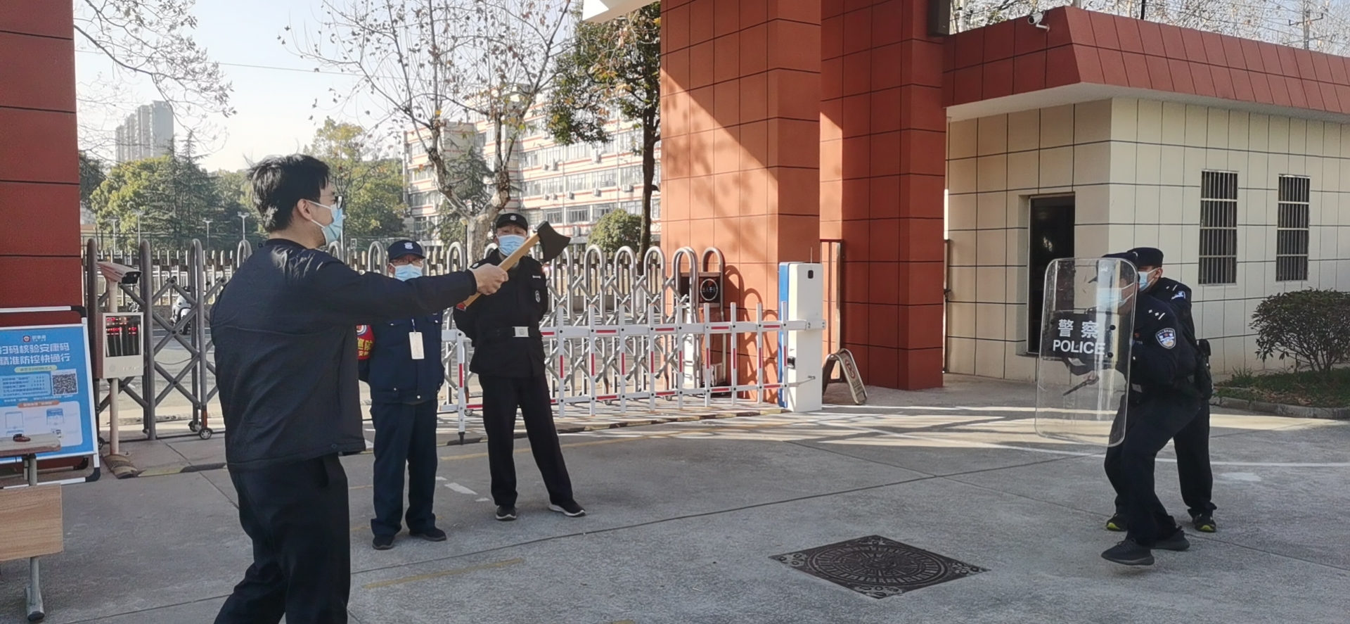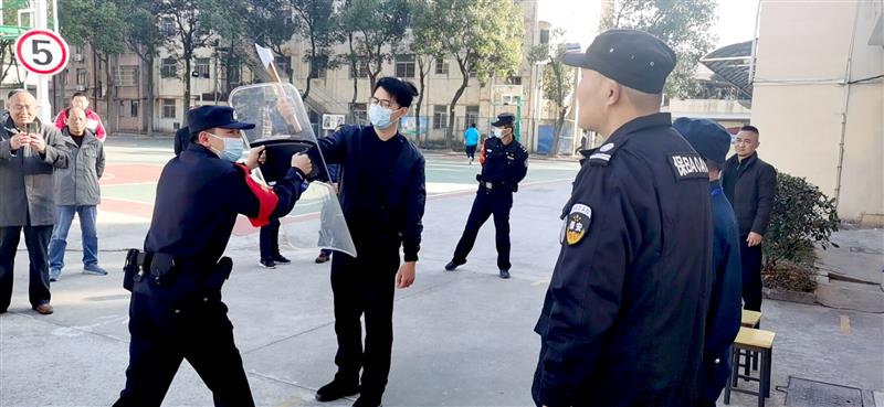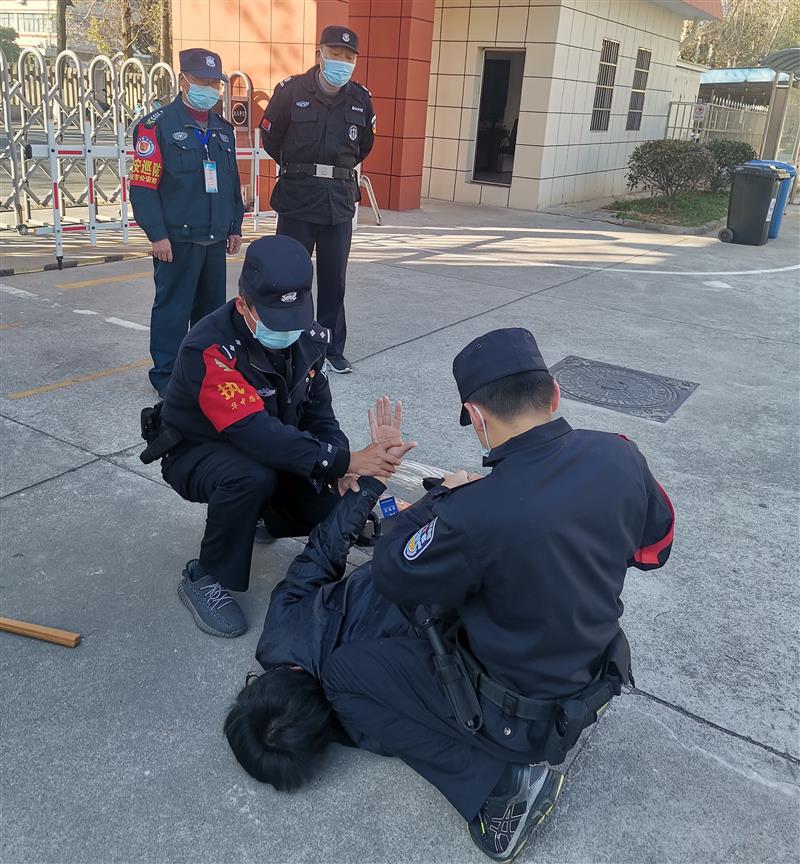 培训结束后,便进行演练。下午240分在学校大门强行闯进一名“持刀歹徒”,学校随即启动反恐防爆应急预案,保安人员及保卫人员立即持器械上前对抗,同时报警110。在派出所民警的指导下将“持刀歹徒”制服。整个演练进展有序、配合默契。
