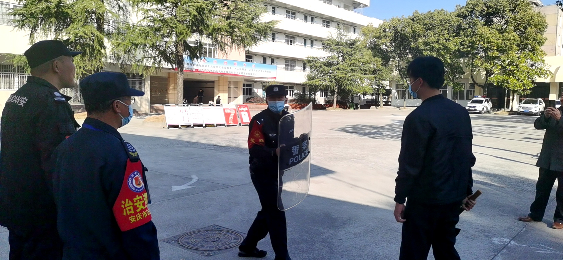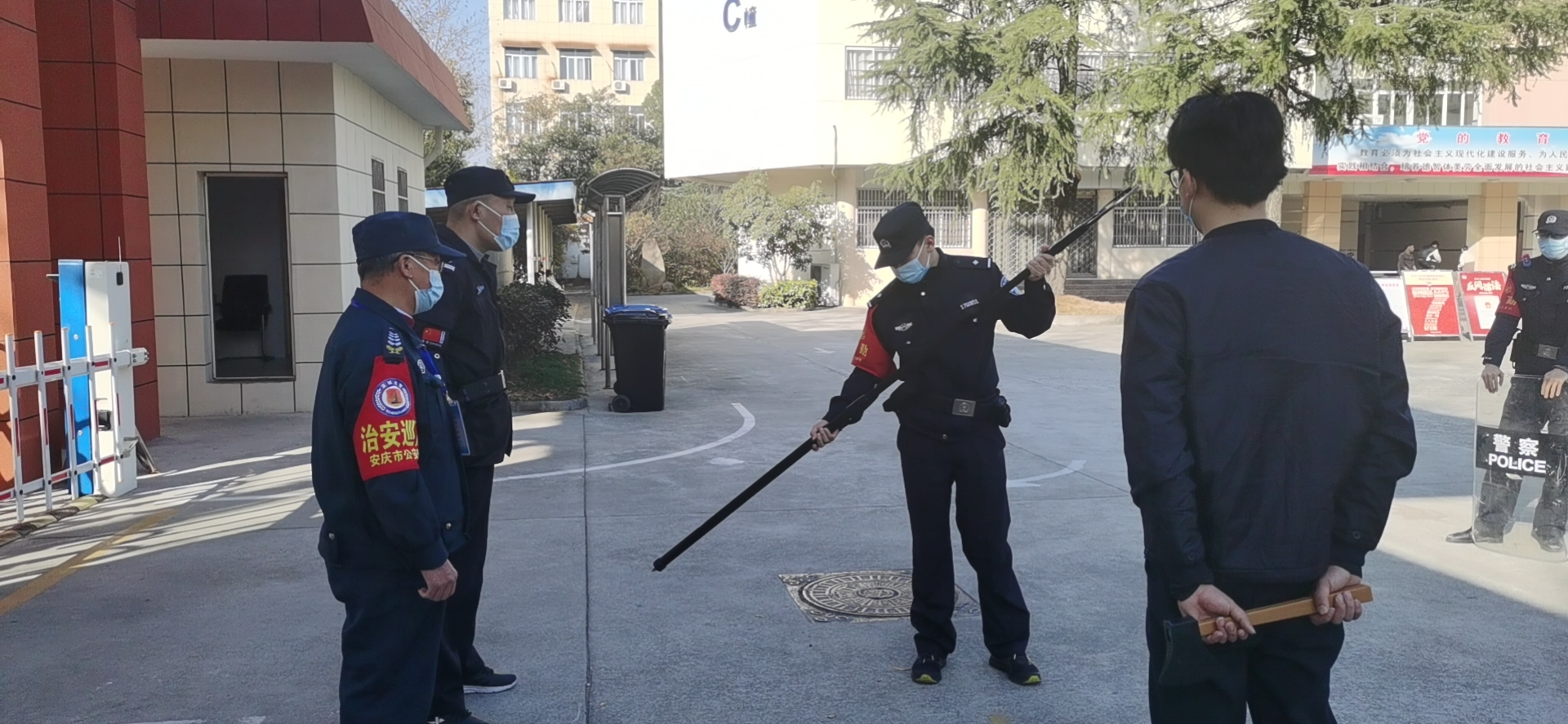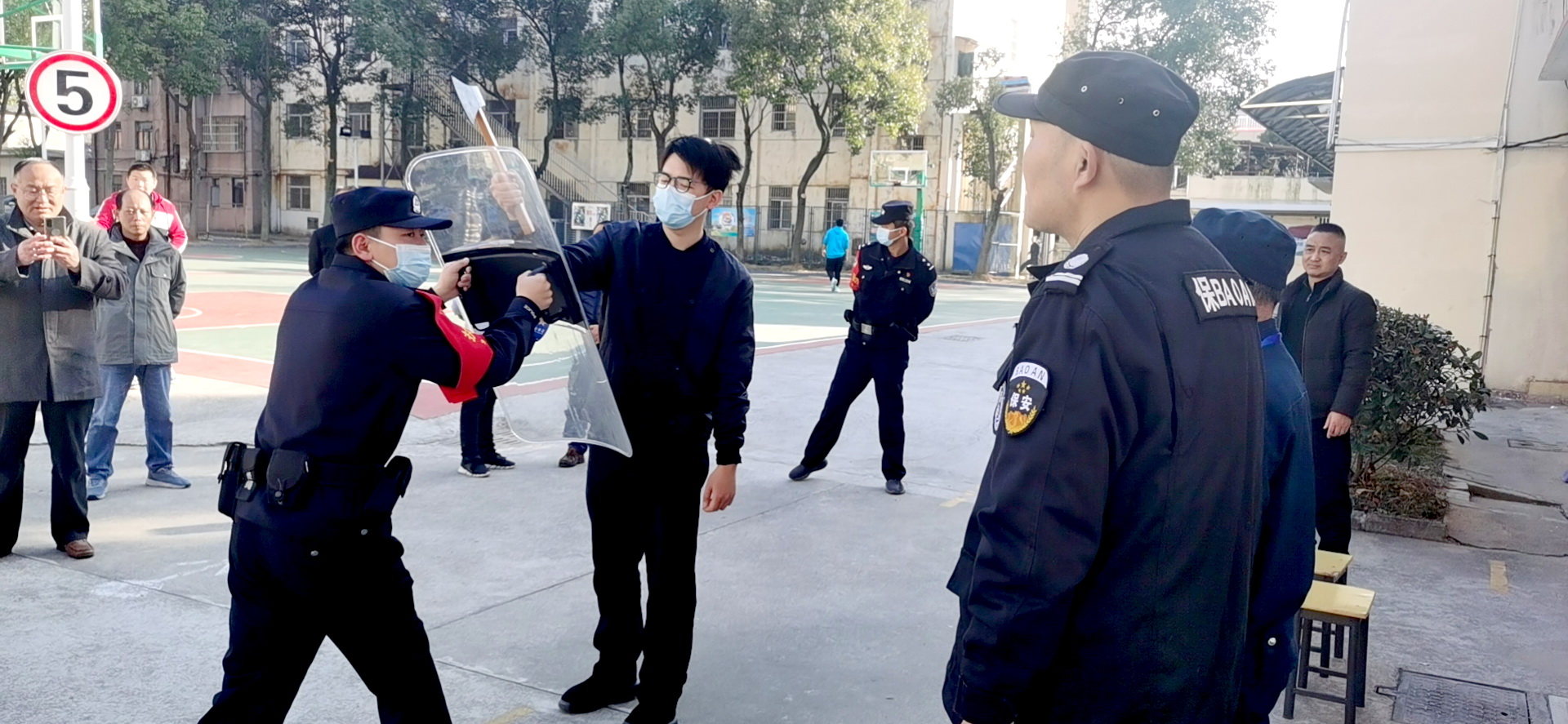 培训结束后,便进行演练。下午240分在学校大门强行闯进一名“持刀歹徒”,学校随即启动反恐防爆应急预案,保安人员及保卫人员立即持器械上前对抗,同时报警110。在派出所民警的指导下将“持刀歹徒”制服。整个演练进展有序、配合默契。