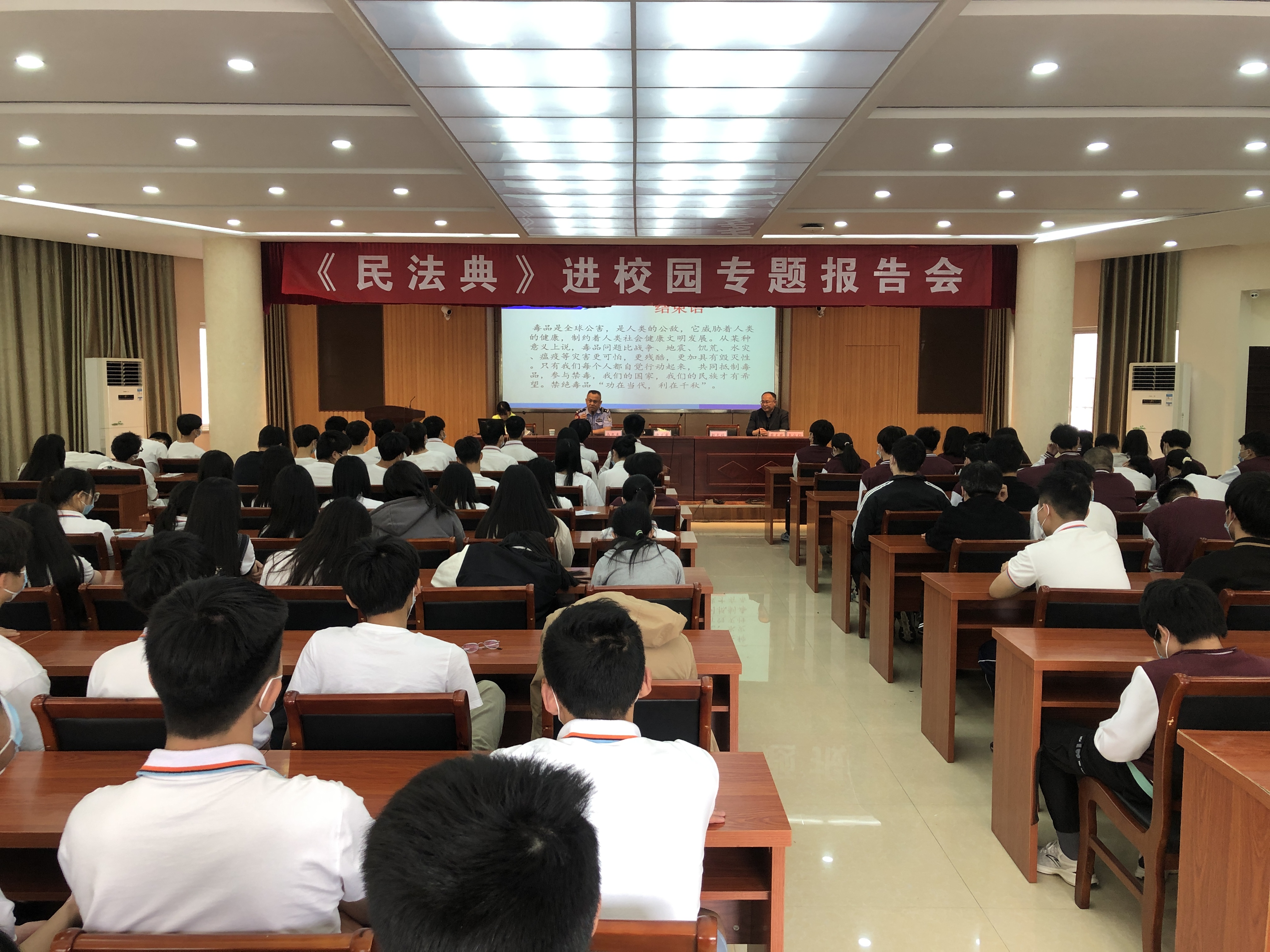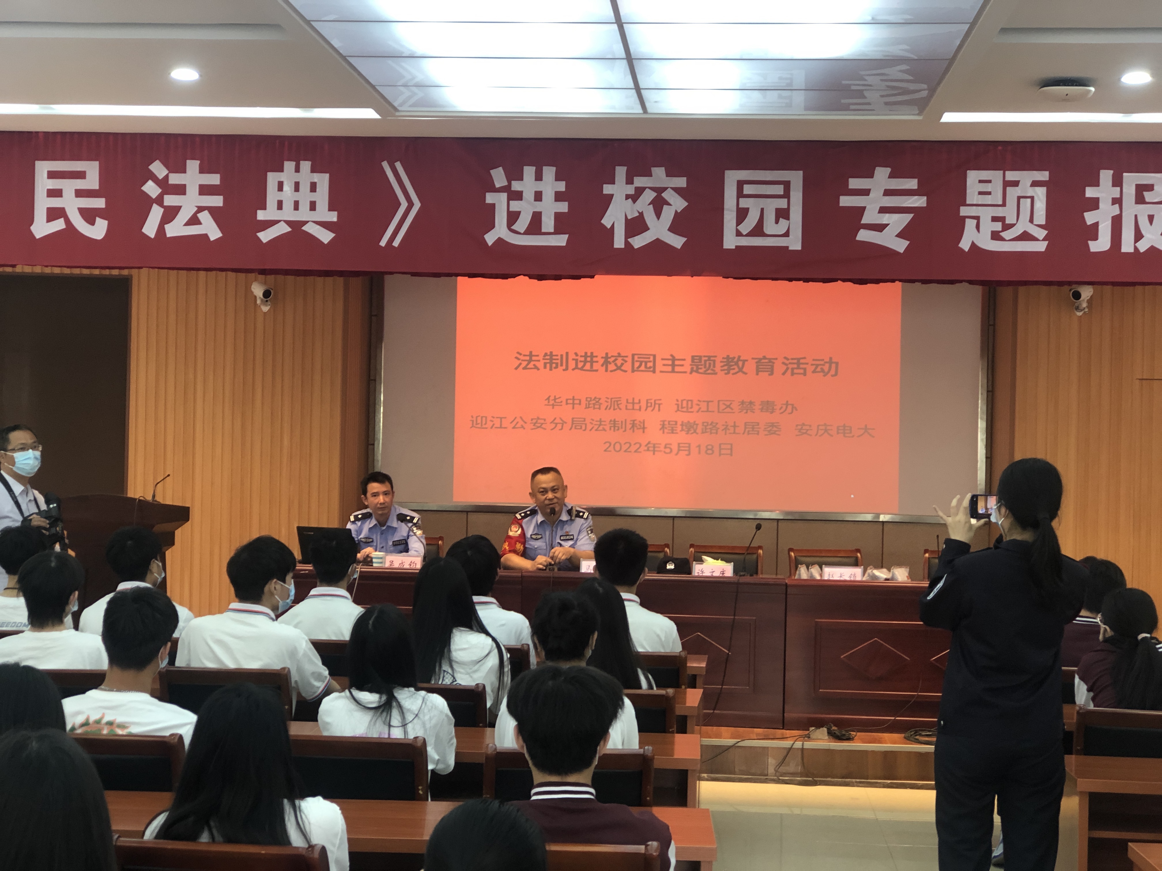 为进一步弘扬法治精神,提升学生法治意识,切实做好青少年《民法典》学习教育,5月18日上午,华体网页版页面登录与华中路派出所、迎江公安分局法制科、迎江区禁毒办、程墩路社居委联合举办“法治进校园主题教育活动”。华中路派出所教导员马忠东、迎江区禁毒办主任许文庆、迎江公安分局法制科副科长吴承钧、程墩路社居委副书记赵长锁,报告会由副校长周光纯主持。