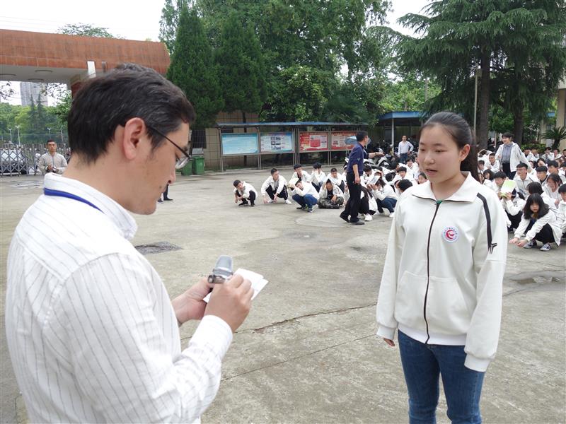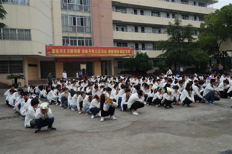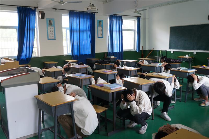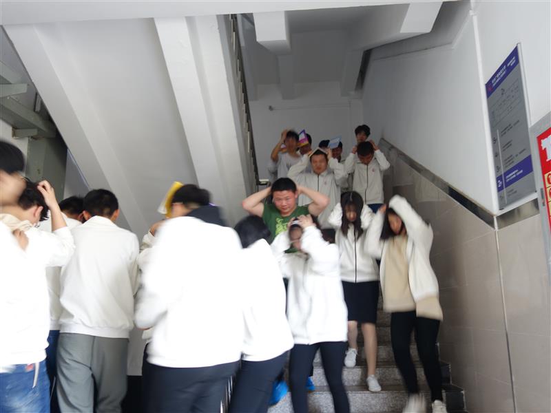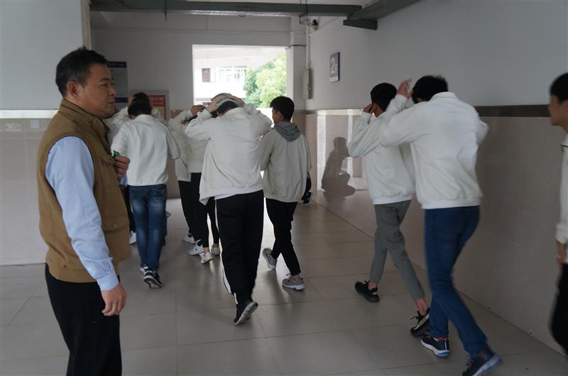 下午3时50分,校园广播响起:“现在地震来袭,请全体师生紧急避震”,同时,“地震”警报响起。听到警报后,各楼层和安全区域疏散指挥员迅速到达指定位置,行政人员和无课教师立即投入到学生疏散护导之中,各教学班上课教师立即停止授课并指挥靠门最近的两位同学迅速打开教室大门,指导学生就近躲避在课桌下和承重墙的墙根、墙角等相对安全的区域避震,在最短的时间内完成双手抱头、蹲地、用课本或书包保护头部等一系列避震动作。30秒后,“地震”暂停,“紧急疏散”信号发出后,上课教师立即指挥同学们双手抱头,分成两组按照指定线路迅速有序撤离危险场所。两分钟后,全校师生安全撤离到指定的安全区域--校操场,各班迅速清点、报告了学生数,对缺失人员按规程实施了营救。职成处主要负责人程学刚对本次演练进行了总结,校园防震避险和疏散演练圆满结束。