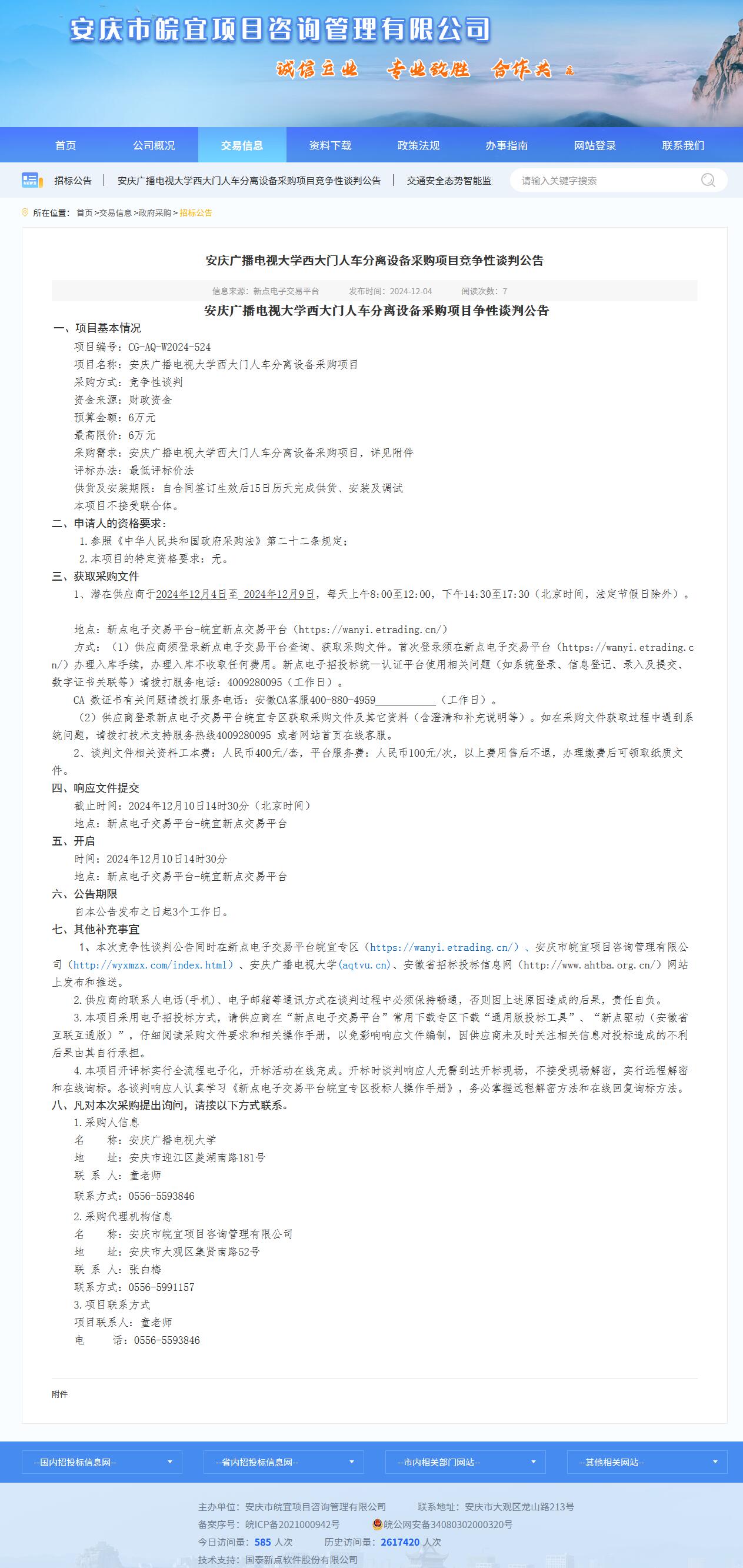 安庆广播电视大学西大门人车分离设备采购项目争性谈判公告