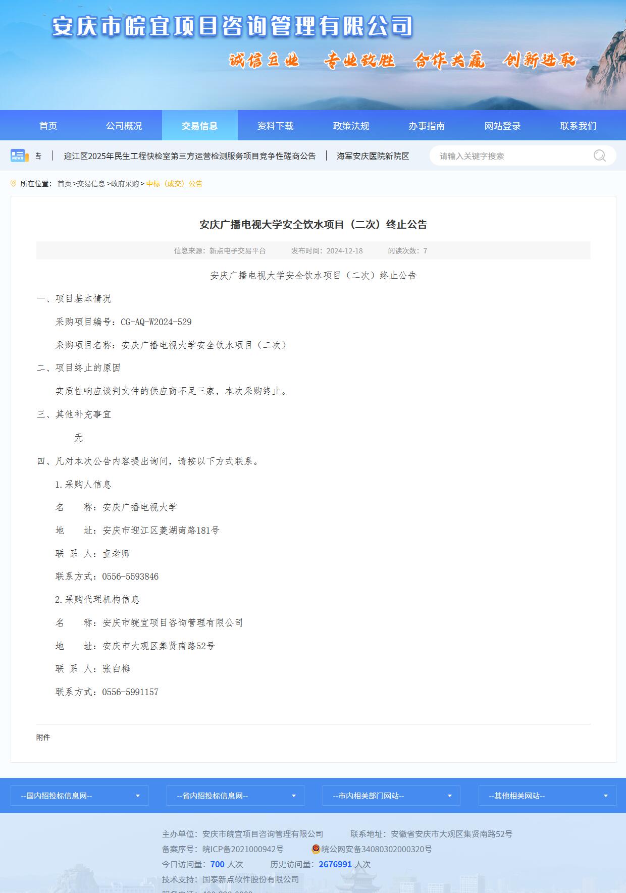 安庆广播电视大学安全饮水项目(二次)终止公告